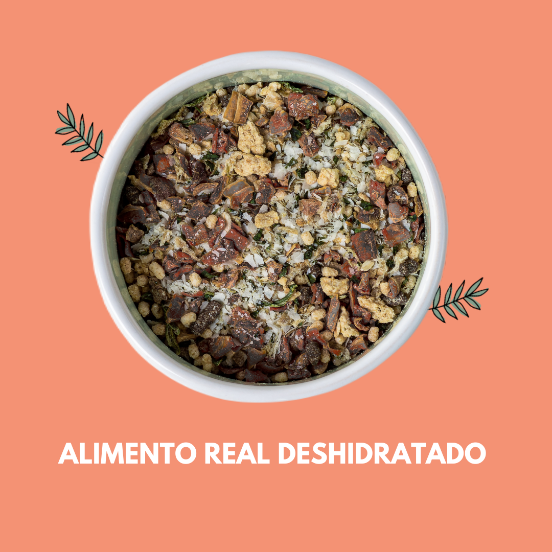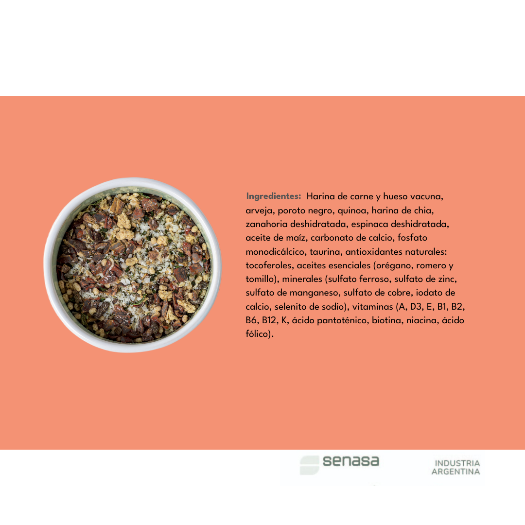 Priorizamos el aporte de proteína de origen animal, SIN PROCESOS QUÍMICOS INDUSTRIALES, deshidratados a bajas temperaturas, de forma tal de garantizar la mayor biodisponibilidad posible de aminoácidos esenciales para tu mascota.