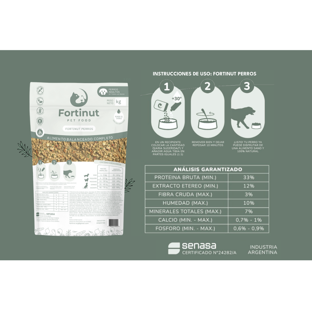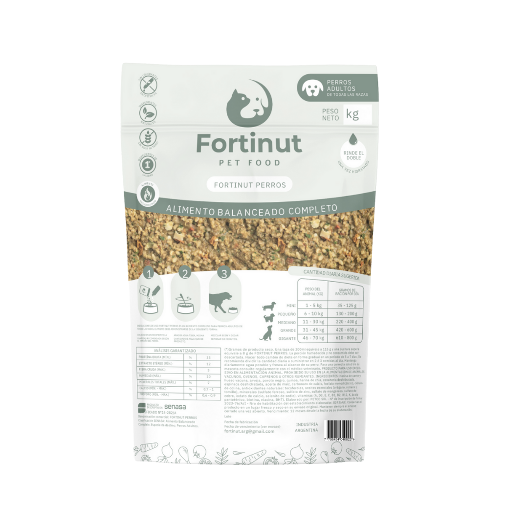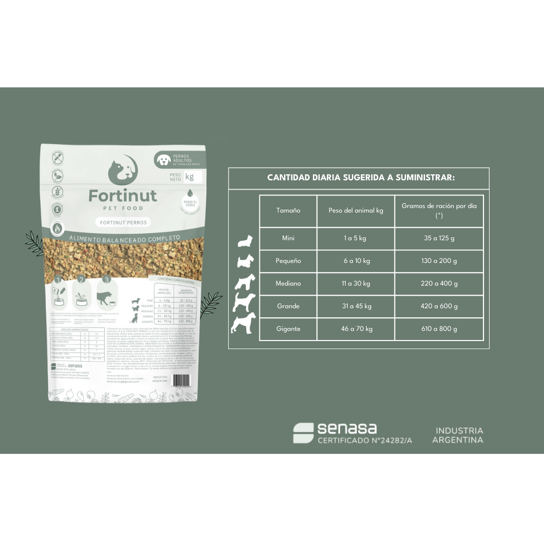 (*) Gramos de producto seco. Una taza de 200 ml equivale a 115 g y una cuchara sopera equivale a 8 g de FORTINUT PERROS.