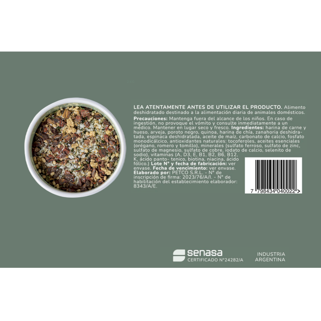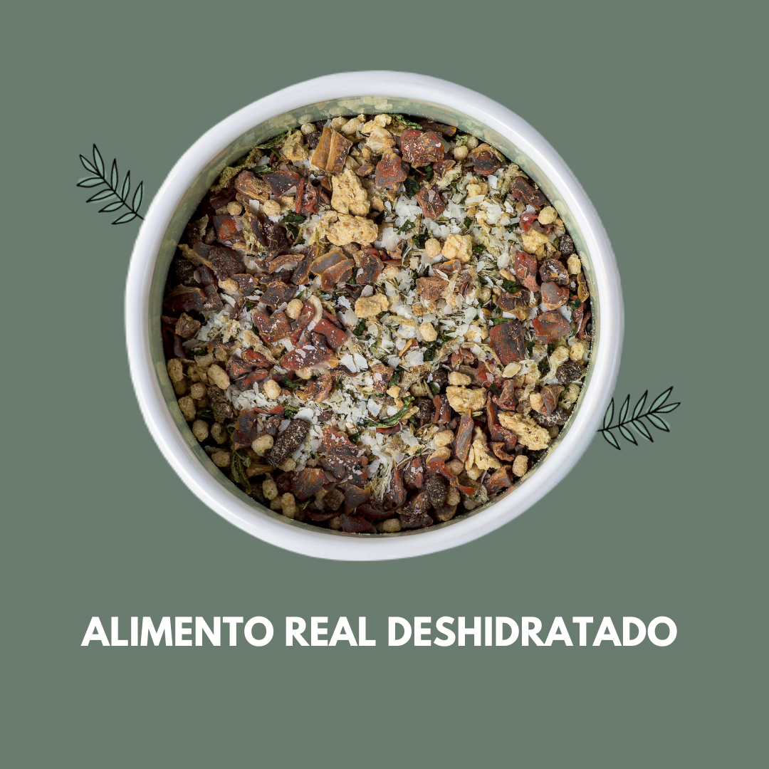 Priorizamos el aporte de proteína de origen animal, SIN PROCESOS QUÍMICOS INDUSTRIALES, deshidratados a bajas temperaturas, de forma tal de garantizar la mayor biodisponibilidad posible de aminoácidos esenciales para tu mascota.